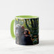 Un chimpanzé femelle avec un regard calme et sérieux se déplace dans une forêt pleine de lumière, avec son petit bébé singe accroché à son dos, le bébé regarde autour avec curiosité, ses petits yeux pétillants et son visage tout mignon montrent une vraie complicité avec son père, les feuilles vertes et les touches de couleurs des fleurs ajoutent une ambiance naturelle et paisible, une scène qui montre la tendresse et la force du lien entre ces deux primates.