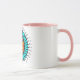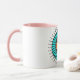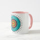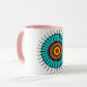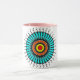 Une belle tasse en céramique présentant un design de mandala vibrant turquoise et orange. Ce motif circulaire complexe apporte une sensation de paix et une touche artistique à votre boisson préférée."