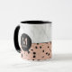 Un élégant mug personnalisé avec un motif doré rose branché aux taches noires sur une motif en marbre blanc. Un cadre rond noir encercle votre monogramme et votre nom des deux côtés de cet article. Modifiez l'exemple de texte avec le texte souhaité.