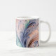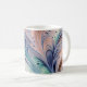 Un design marbré envoûtant présentant des motifs tourbillonnants en forme de plumes dans des tons bleus, verts et pêche, accentués de points bleus foncés pour ajouter de la texture et de la profondeur, parfait pour les impressions artistiques, la décoration ou les visuels de campagne