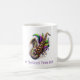 This ceramic coffee mug is shown with Mardi Gras images, Text of "Let the good times roll' is beneath the prints.
