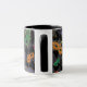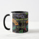 Cette tasse à café Mardi Gras présente des masques brillants en vert, rose, rouge violet, turquoise et orange sur un arrière - plan de motif diamant arlequin noir et gris. Personnalisez avec l'année des fêtes et un nom dans la typographie vert citron. Conçu par un artiste de renommée mondiale ©Tim Coffey.