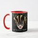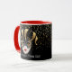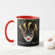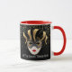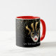Cette tasse combo rouge et blanc a l'image d'un Mardi Gras masques sur de petites étoiles dorées sur un arrière - plan noir. Le texte de "Let the good times roll" se trouve sous le masque de chaque côté de la tasse. Customisez cet objet ou achetez tel que conçu. Couleurs : manche et intérieur rouge, arrière - plan noir, étoiles dorées et masques noir et or. Images et texte imprimés sur.