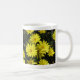Des marguerites jaunes aux centres oranges en arrière - plan de feuillage foncé ornent chaque côté de la tasse. Personnalisez avec le nom de l'utilisateur.
