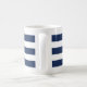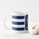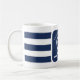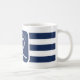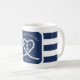 Tasse de mariage rayée bleu marine et blanc. Idéal pour un mariage Navy (militaire) ou de maison de lac. Le design présente une corde en forme de cœur avec une ancre et les initiales du couple au milieu. Personnalisez-le avec vos détails de mariage.