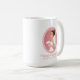 Tasse à café personnalisée avec l'illustration d'une mariée souriante tenant un bouquet de fleurs dans sa robe mariage blanche et vêtue d'un voile. Placez-vous à l'intérieur d'un cadre rose ovale avec une bordure en coquille.