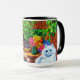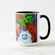 Mug à café mettant en vedette la peinture animale de Louis Wain Master of Cat College (1860-1939). Un chat blanc réfléchi aux yeux bleus saisissants se tient à côté d'un assortiment vibrant de belles fleurs. Le majestueux collège de chats se dresse dans l'arrière - plan sous un ciel rose et bleu. Un cadeau merveilleux pour l'art amoureux des chats et anglais.