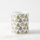 Cette tasse a un design moderne du milieu du siècle des arbres de Noël dans différents styles. L'une a une grille avec des rectangles avec des éclats à l'intérieur. Un autre comporte des rectangles arrondis avec des rectangles plus petits à l'intérieur. Un troisième a des lignes courbes avec des étoiles sur elles. L'arbre final est un triangle avec d'autres petits triangles à l'intérieur