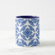 Mug dans un kimono japonais classique motif de médaillons stylisés, à quatre sens, de feuilles et de fleurs en bleu cobalt profond sur un arrière - plan blanc