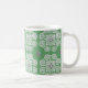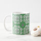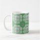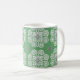 Bande de café au design Scroll Medallion. arrière - plan vert moyen, avec une impression de médaillon de défilement répétitif blanc. Détail gris et noir. Base blanche, poignée et intérieur.