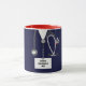 Expérience médicale unique, diplôme, anniversaire ou cadeau de vacances tasse, avec maquillage d'hôpital bleu marine créatif, stéthoscope et drôle couteau de l'armée suisse. Modifier le texte pour ajouter le nom ou les initiales monographiques du médecin.