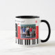 Grand piano clés tasse de Noël pour un professeur de piano. Clés de piano noir et blanc et flocons de neige sur rayures rouges, avec élégante typographie de script "Je vous souhaite des vacances joyeuses ! Nous vous aimons !" et "Meilleur professeur de piano jamais". et 2 photos de votre choix. Elégante idée cadeau d'hiver personnalisé pour lui.