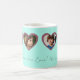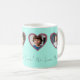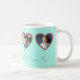 Concevez votre propre tasse photo avec ce mignon modèle photo aqua avec de l'espace pour ajouter 4 photos personnalisées. Téléchargez vos photos préférées et customisez le nom avec votre personnalisation. Un grand cadeau pour grand-mère quand vous ajoutez vos propres photos des petits-enfants ou des animaux de compagnie! Dispose d'une couverture aqua turquoise avec des arrière - plans cardiaques parties scintillant sur les modèles photo cardiaques.