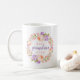 Cute Mère's Day tasses à café personnalisées avec la citation "Meilleure grand-mère jamais". Ajoutez votre propre nom ou message personnalisé dans la jolie couronne florale rose pastel et violet à l'aquarelle. Utilisez les outils de conception pour choisir n'importe quelle couleur arrière - plan, modifier les polices de texte et les couleurs et ajouter vos propres photos pour créer un cadeau de fête des mères pour maman et grand-mère.