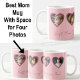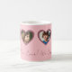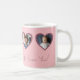 Concevez votre propre tasse photo avec ce modèle photo rose mignon avec de l'espace pour ajouter 4 photos personnalisées. Téléchargez vos photos préférées et customisez le nom avec votre personnalisation. Un grand cadeau pour maman quand vous ajoutez vos propres photos des enfants ou des animaux de compagnie! Dispose d'une couverture rose avec des arrière - plans de coeur de parties scintillant sur le coeur modèles photo.