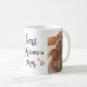 Tasse à café avec le texte "meilleure maman jamais" dans un script mignon flanqué de coeurs rose vif. Deux photos personnalisées.