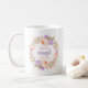 Les tasses à café de la Fête des Mères personnalisées avec la citation "Meilleure tante Ever". Ajoutez votre propre nom ou message personnalisé dans la jolie couronne florale rose pastel et violet à l'aquarelle. Utilisez les outils de conception pour choisir n'importe quelle couleur arrière - plan, modifier les polices de texte et les couleurs et ajouter vos propres photos pour créer un cadeau de fête des mères pour maman et grand-mère.