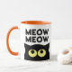 Meow Meow drôle de mème de chat dessin animé café cadeau de tasse pour les propriétaires d'animaux. Coupe blanche mignonne avec dessin animé kitty et citation humoristique. Idée de cadeau amusant pour amoureux des animaux, propriétaire de chat, personne de chat, papa de chat, amoureux des animaux, etc. Couleur orange ou personnalisée à l'intérieur et poignée. Silhouette de chat drôle avec de grands yeux jaunes.