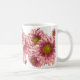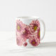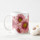 Cette jolie tasse décorative présente des chrysanthèmes roses exquis. Les couleurs pétales vont d'un blush pâle à magenta profond vers le centre. Les centres mêmes sont verts et jaunes.