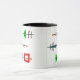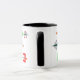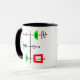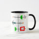 Cette tasse a un design moderne du milieu du siècle qui ressemble à un mobile avec demi-cercles, rectangle déformé, triangle, lignes et cercles en rouge, vert, turquoise, orange et noir.