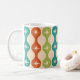 This is coffee mug featuring elegant mid century modern atomic starbursts pattern placed on ogee ovals in red, green, mustard and teal.