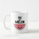 Mug mignon et kawaii représentant une tranche adorable de pastèque avec des yeux brillants et un sourire doux. Au-dessus de la tranche de pastèque se trouvent les mots One In A Melon en lettres noires.