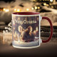 Cette mignonne Mug présente une petite souris sur une table décorée de Noël avec des bougies brillantes. Les lumières dansent. Un joli petit cadeau de Noël pour n'importe qui ! Texte personnalisable.