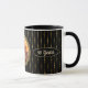 Un cadre doré à pétoncles au milieu montre vos photos préférées sur cette élégante tasse de conserves de saké Golden Mariage Anniversary. Il est facile de télécharger votre propre photo. De chaque côté de la photo se trouve votre texte personnalisé dans un étiquette ovale noir encadré d'or. Tout est placé sur un arrière - plan noir avec décoration de rideau de perle d'or. Un beau cadeau de gardien pour ce couple spécial.