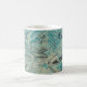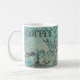 Sketched art of a steaming coffee cup next to a coffee grinder on abstract blue background.