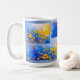 Bright modern artwork of sweeping flower fields wraps a white ceramic mug with sunshine.