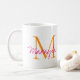 This modern coffee mug features a monogram and name in stylish pink script and orange typography. It is easily customizable.