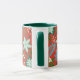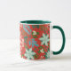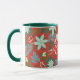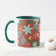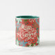 Cette belle tasse de Noël présente des éléments floraux dessinés à la main dans différentes teintes de vert, menthe, turquoise, blanc cassé. On y trouve du pin, des fleurs, des sprigs, des feuilles, des baies ainsi que des lettres modernes en blanc cassé, lisant "Joyeux Noël". La couleur arrière - plan est un rouge traditionnel de Noël.Oeuvre originale de Caroline Bonne Müller