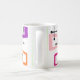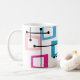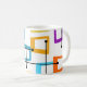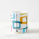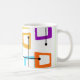 Cette tasse a un design de rectangles qui sont étirés sur une extrémité dans des couleurs super, orange, vert, turquoise, violet, bleu, rose et jaune avec des lignes atomiques qui les sillonnent.