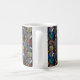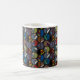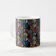 Cette tasse a un design moderne du milieu du siècle de moitiés ovales, certaines solides et certaines rayées, dans les couleurs masculines sur un champ de gris foncé.