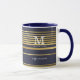 Bandes dorées horizontales sur bleu profond, avec nom personnalisé et initiale, avec les mots "moments café"