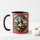 La Mona Lisa portant un chapeau de Père Noël est représentée en vitrail.