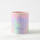 Un arrière - plan holographique branché aux couleurs pastel unicorne et arc-en-ciel rose, violet, or rose, vert menthe. Décoré avec des gouttes de parties scintillant en or rose, rose et violet. Personnalisez et ajoutez un nom, écrit avec un script de style à la main moderne avec des swashes. Lettres violettes. Pour que les swashes ne suppriment que le nom de l'échantillon, laissez les espaces ou émoticônes devant et après le nom.