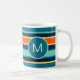 Tasse monogramme striée à l'aide d'une palette de couleurs rétro bleu et orange classique. La couleur des bandes et du cercle monogrammé peut être changée.
