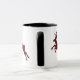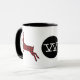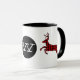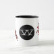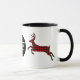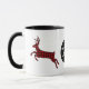 Tasse à thème de vacances cabine rustique avec des graphiques de deux cerfs réalisés dans le style de buffle rouge et noir plaid. Personnalisez le monogramme d'une lettre blanche, sur le cercle noir, pour répondre à vos besoins. #holiday