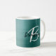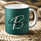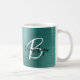 Cette élégante tasse à café personnalisée présente un monogramme et un prénom en écriture moderne noire et blanche sur un fond en métal brossé bleu sarcelle.