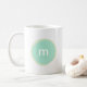 Cette tasse à café monogrammée avec un sceau à deux tons en vert menthe évoque l'apparence d'une enveloppe de cire scellée. Moderne, mais décontracté et amusant. Une partie d'une collection de Parcel Studios.