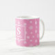 motif vectoriel moderne de flocons de neige blancs sur arrière - plan rose sur cette tasse festive. Ce design à thème hivernal comprend également un monogramme qui peut être personnalisé avec votre nom et votre initiale.