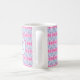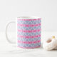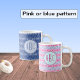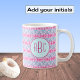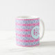 Le design de cette tasse a été créé par un motif répétitif de roues de bicyclettes aux couleurs roses profondes et aqua. Personnalisez ceci en entrant les trois initiales de votre choix dans les cases indiquées pour faire un monogramme. Un cadeau unique pour tout cycliste passionné.