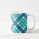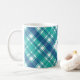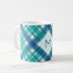 Cette tasse est dotée d'un motif plaid en diagonale turquoise et bleu foncé. Un diamant blanc, au centre, offre un monogramme personnalisé.