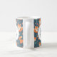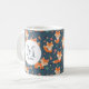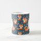 Une tasse avec un motif fait de renards orange mignons et heureux. Arrière - plan vert foncé. Petits champignons et feuilles parsemés. Un cercle blanc superposé avec votre nom et votre monogramme initial à l'intérieur.