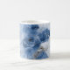 Un mug dans des couleurs d'encre liquide marbre bleu foncé, blanc et bleu clair. Le design est un design rêveur romantique et élégant avec des traces dorées et argentées comme la brise marine côtière scintille. Il ressemble à une texture de pierre de marbre abstraite et à de la lave fluide en même temps. Ce design convient parfaitement aux maisons côtières et fait entrer la brise dans votre pièce.