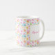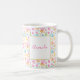 Une tasse avec un motif délicieux et fantaisiste. Coeurs, lettres d'amour, muffins, tulipes et cerises apportent joie et bonheur à ce mignon petit motif. Jolies couleurs pastel. Un carré blanc avec une fausse bordure en feuille d'or superposée avec votre texte à l'intérieur.