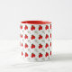 Une tasse à café rétro avec un motif de fraises rouges et de fleurs de fraises blanches.