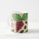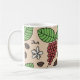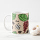 Un plante café avec feuilles, fleurs, baies et grains de café sur un motif élégant.