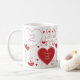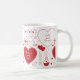Une tasse dessinée avec deux noms de motif valentin, rouge sur blanc. Customisez la tasse avec vos noms de coeur, couleur arrière - plan, entre autres options.